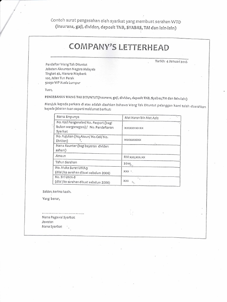 Contoh Surat Pengesahan Untuk Wang Tidak Dituntut Wtd Pdf